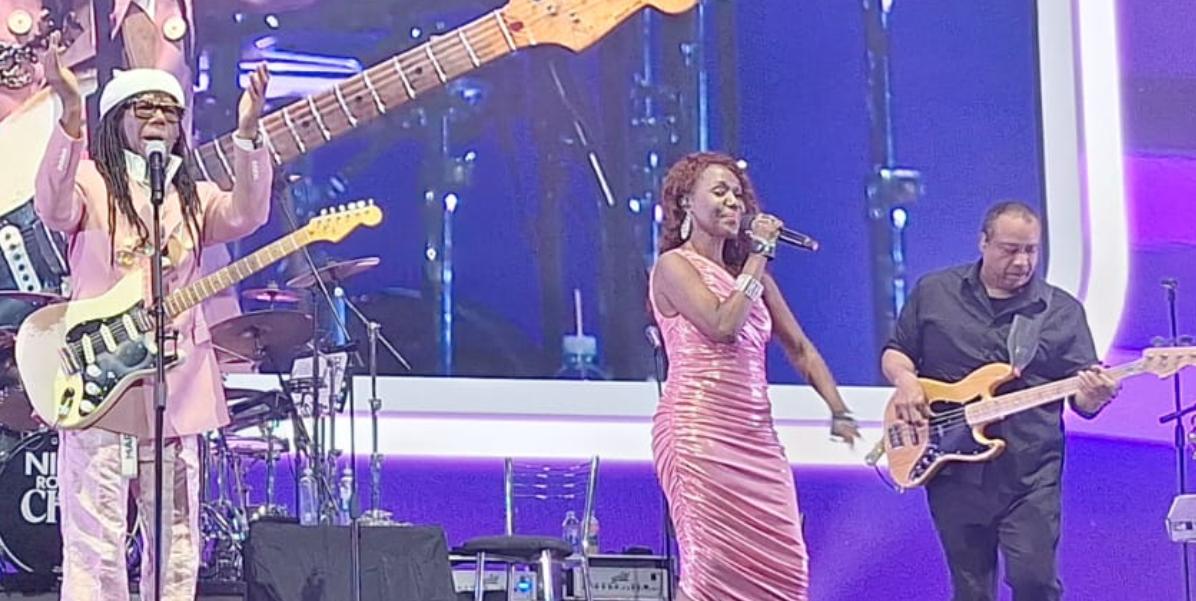 El siguiente bloque fue probablemente el menos logrado de la noche, tal vez por errores no forzados en la elección de canciones y cómo las mismas están ordenadas. “Lost in Music” de Sister Sledge es un microbio al lado del pluscuamperfecto track “Notorious”, esa joya del catálogo de Duran Duran que se mantiene viva como un “Terminador Dance” a lo largo de las décadas. Sin embargo la banda tocó solo un 65 por ciento de los temas, dejando gusto a poco con lo que esas obras significan en las audiencias mundiales, para intercalar después temas bastante menos destacados en la carrera del productor como “Soup for One”, gafe que repara haciendo “Lady (Hear Me Tonight)”, para que el estadio volviese a acelerar los latidos con piernas que no se resisten al movimiento. En uno de los tramos emotivos, donde el anfitrión recordó a sus viejos compañeros y por supuesto ese vínculo emocional con Bernard Edwards, le dedicó la pegadiza “Thinking of You” del grupo Sister Sledge, y luego llegaron pistas disco como “My Feet Keep Dancing” y “Chic Cheer”, pero cuando todo amagaba con languidecer sonó “My Forbidden Lover” con precisión y firme contundencia. Las cantantes Kimberly Davis y Autrey Martells, que se han repartieron toda la noche las voces de esos clásicos pop, volvieron a mostrar su gran protagonismo con aquél hitazo del grupo, mientras el tecladista Rusell Graham sacó a relucir su inesperado rol de segundo guitarrista, bien secundado por el saxo de Kenneth Gioffre y la trompeta de Steven Jankowski, dos bronces demoledores que saben disparar música de manera elocuente en cada instante donde su magistral presencia es requerida.