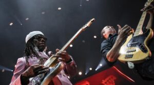 Después de esos cuatro temas, comenzó la relectura de esas magistrales colaboraciones del artista norteamericano con grandes estrellas de la música. Su aporte como productor para otras figuras se pone claramente de manifiesto en las inconfundibles “I’m Coming Out” y “Upside Down”, dos hits gestados para Diana Ross que le cambiaron la cara a la estrella de pelo ensortijado. En esa misma tonalidad y consistencia rítmica sonaron luego “He’s the Greatest Dancer” y “We Are Family”, piezas de Sister Sledge que entraron a los charts de manera inmediata cuando recibieron la mano del brillante productor. Unidas en ese recorrido por cortes de batería o ataques del dueto de bronces, el show va transitando un formato dinámico donde el anfitrión suele meter algunos comentarios o pedir de forma muy entusiasta esos coros que el público argentino sabe hacer de memoria. Pero el asunto se detuvo unos segundos cuando Nile Rodgers decidió contar pormenorizadamente aquél vínculo que lo unió a Marie Louisse Ciccone, antes que la historia la conociese como esa gran figura internacional que es Madonna. En su segundo álbum, producido por el notable violero y compositor emergieron esos dos hits atómicos como “Material Girl” y “Like a virgen”. El artista de color le dijo que el primer corte era del disco “Material Girl” , pero la rubia norteamericana no titubeó en decirle lo contrario y tomar decisiones que dejarían traslucir el poder de una mujer decidida. Los dos tracks son cañonazos pop que impactan en la multitud de manera decisiva, pusieron al estadio en modo discoteca descontrolada.